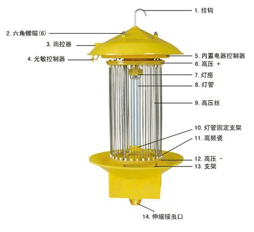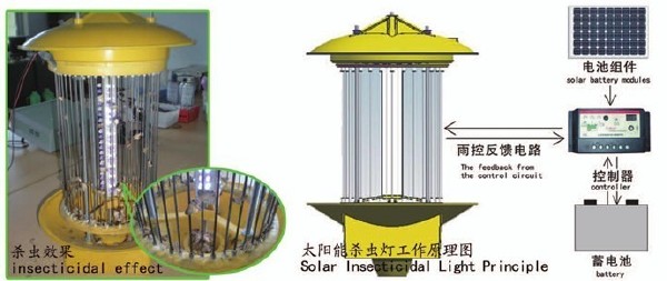 太陽能殺蟲燈是利用太陽能電池板作為用電來源,其將白天太陽能發(fā)的電貯存起來,晚上放電給殺蟲燈具,供其工作。殺蟲燈具是利用365±50nm波長紫外光對昆蟲具有激備較強(qiáng)的趨光、趨波、趨色、趨性的特性原理,確定對昆蟲的誘導(dǎo)波長,研制專用光源,利用放電產(chǎn)生的低溫等離子體,紫外光輻射對害蟲間生的趨光興奮效應(yīng),引誘害蟲撲向燈的光源,光源外配置高壓擊殺網(wǎng),殺死害蟲,使害蟲落下專用的接蟲袋內(nèi),達(dá)到滅殺害蟲的目的。